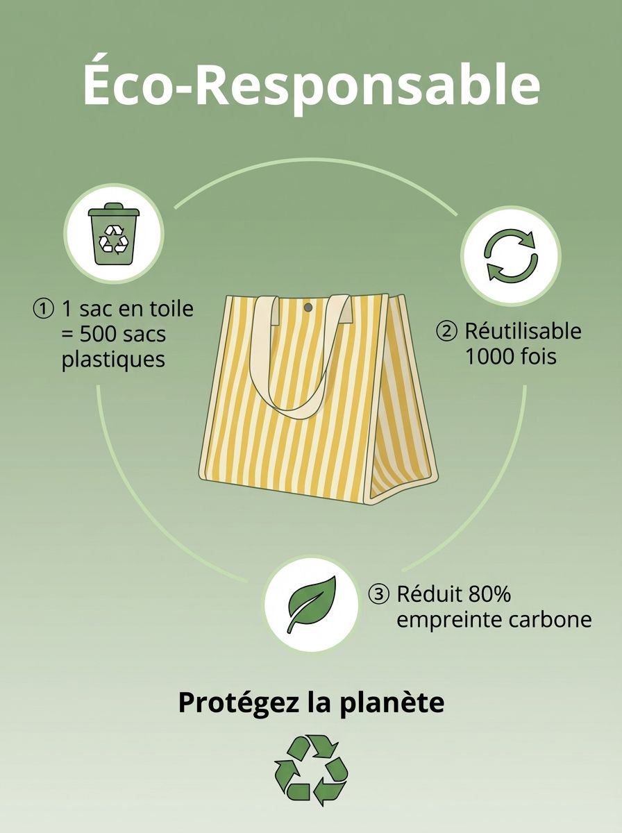 ● Conçu en toile écologique robuste, ce sac à provisions portable est réutilisable et respectueux de l’environnement, parfait pour réduire l’usage du plastique.