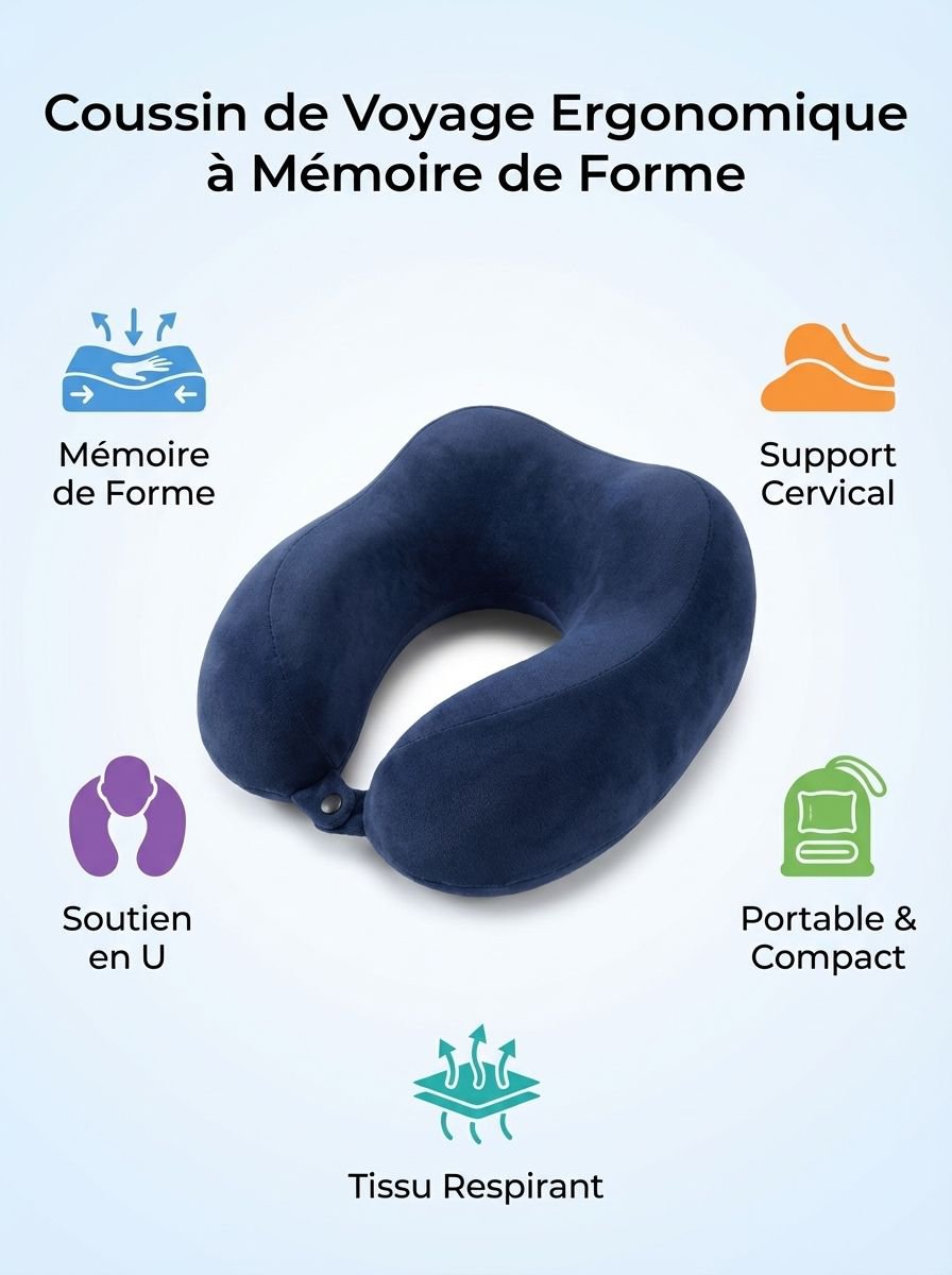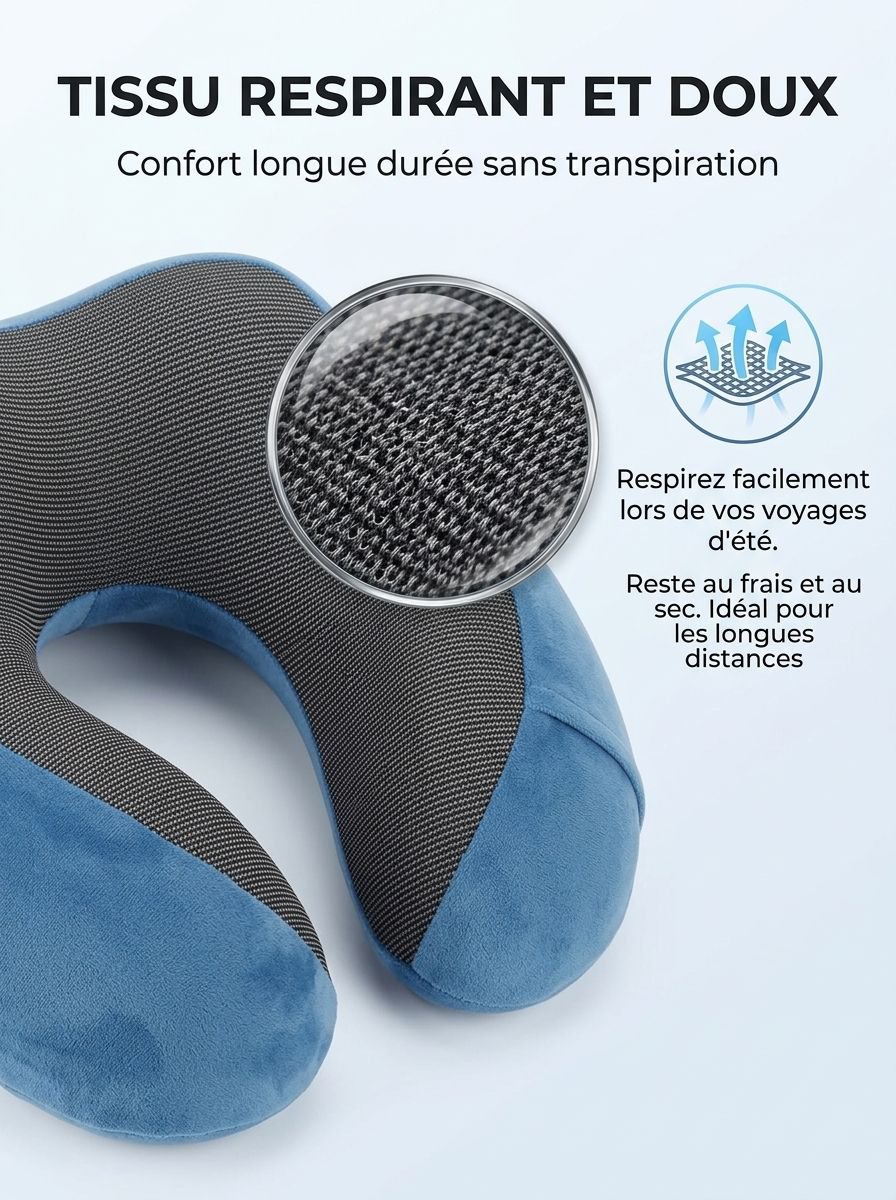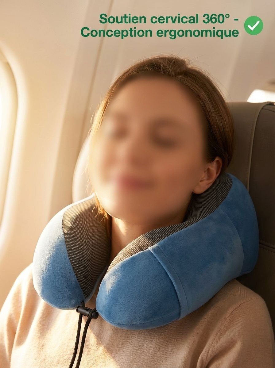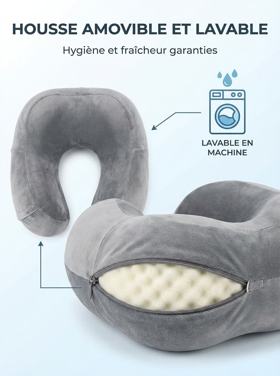 ● Soutien ergonomique optimal grâce à sa forme en U et sa mousse à mémoire de forme, réduisant efficacement les douleurs cervicales lors de longs trajets. ● Design bosselé innovant qui favorise la circulation de l’air et procure un massage léger pour un confort supérieur pendant le voyage. ● Housse douce et respirante, amovible et lavable, assurant une hygiène irréprochable et une utilisation prolongée dans le temps. ● Compact et léger, se range facilement dans votre sac de voyage, idéal pour l’avion, le train ou la voiture, vous permettant de vous reposer partout.