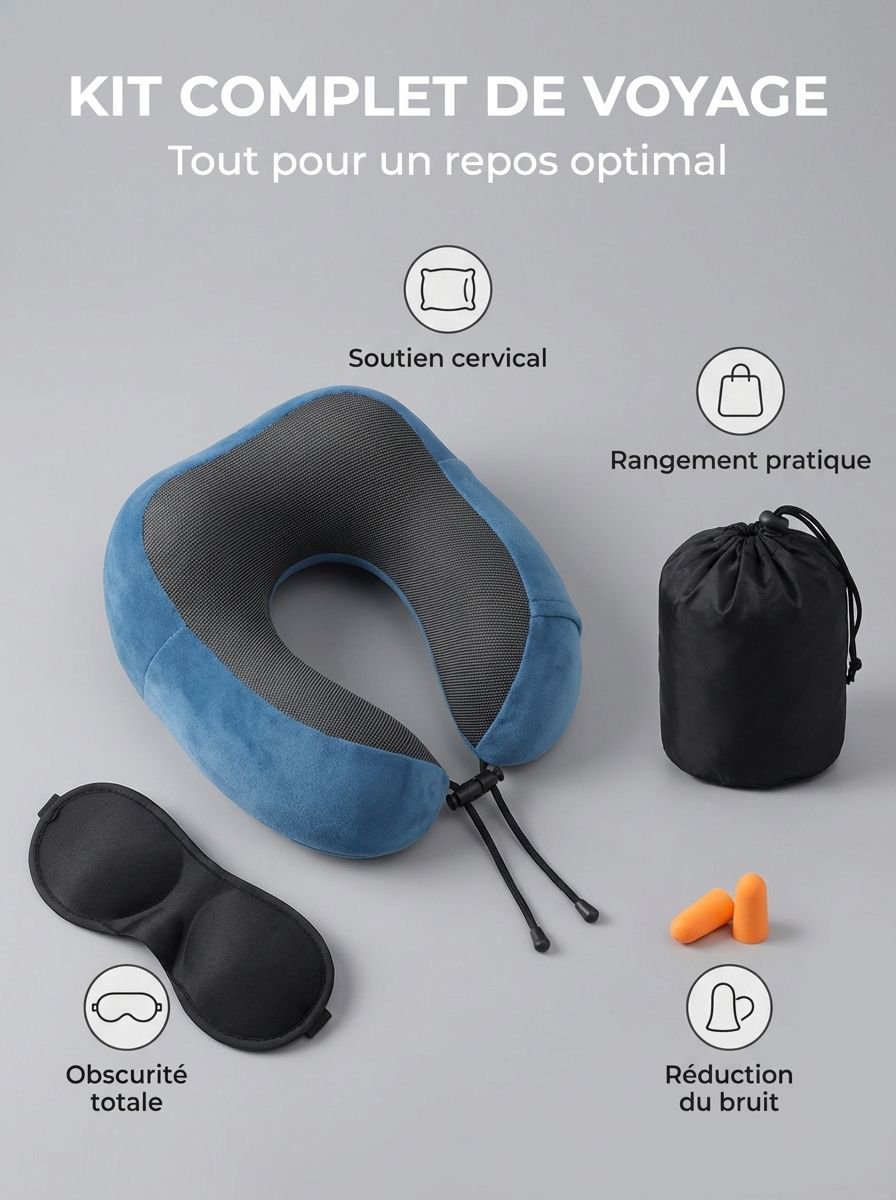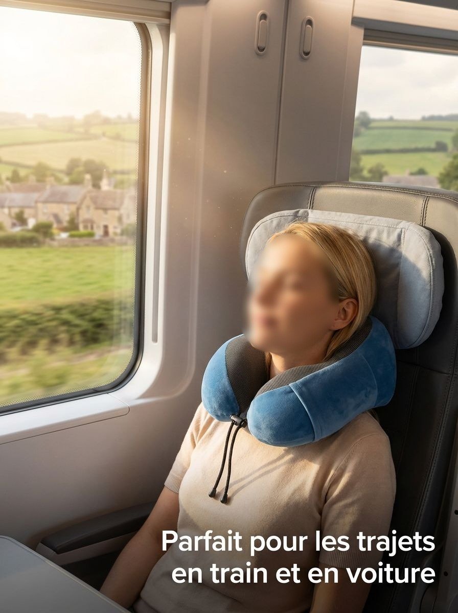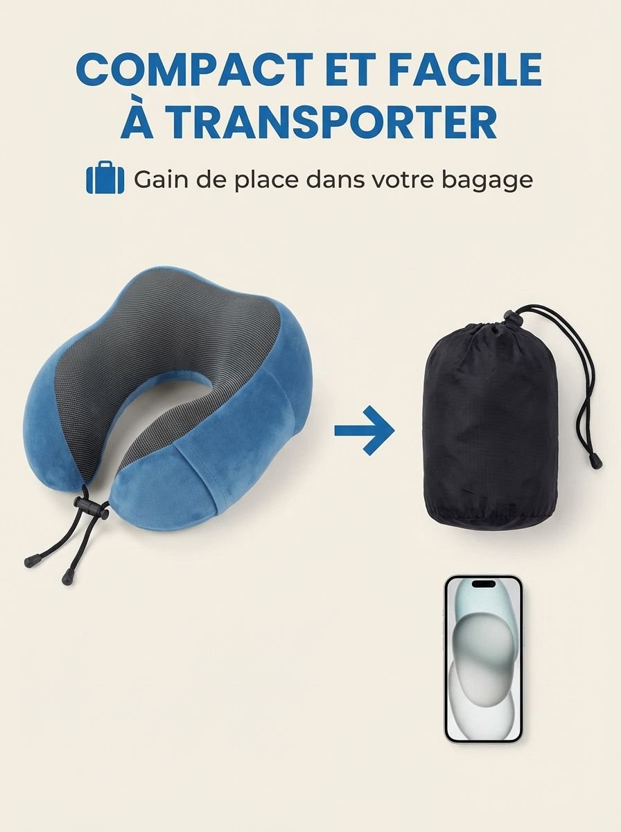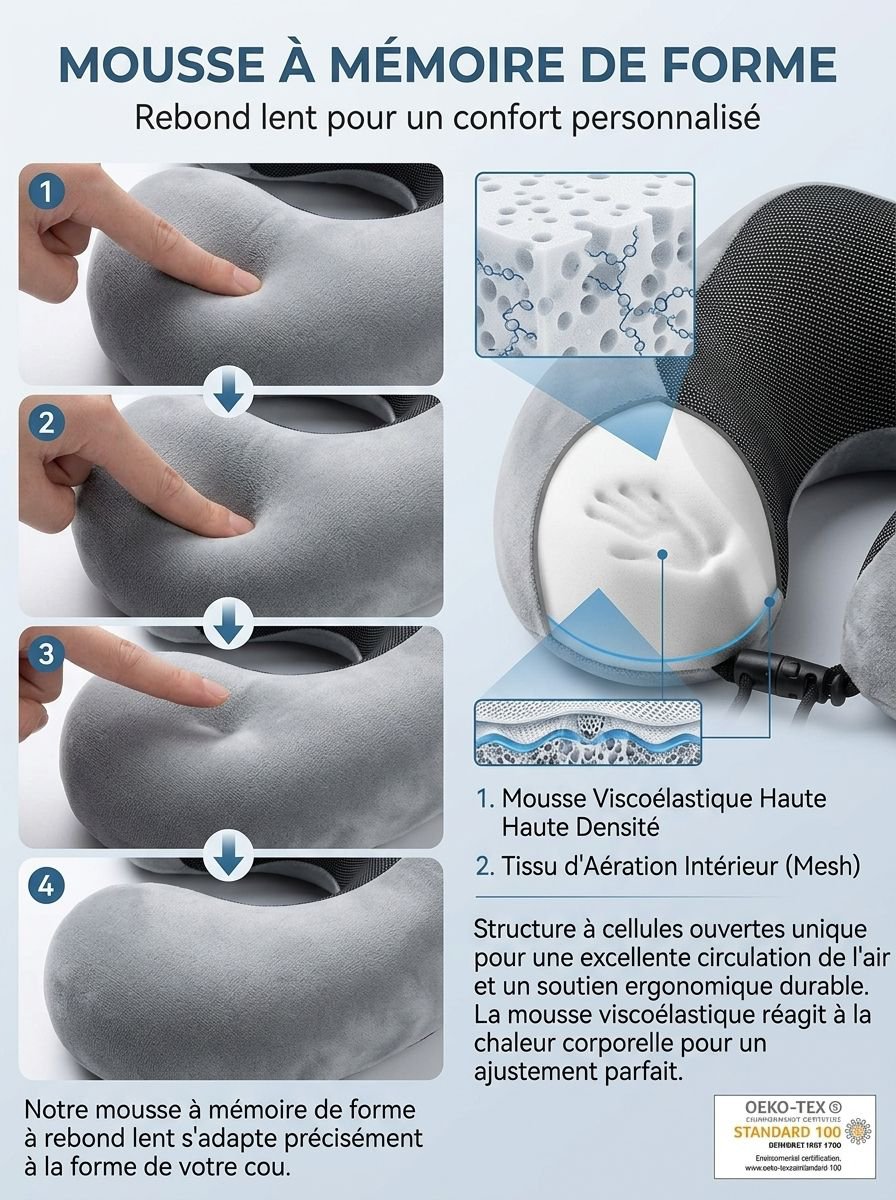 ● Soutien ergonomique optimal grâce à sa forme en U et sa mousse à mémoire de forme, réduisant efficacement les douleurs cervicales lors de longs trajets. ● Design bosselé innovant qui favorise la circulation de l’air et procure un massage léger pour un confort supérieur pendant le voyage. ● Housse douce et respirante, amovible et lavable, assurant une hygiène irréprochable et une utilisation prolongée dans le temps. ● Compact et léger, se range facilement dans votre sac de voyage, idéal pour l’avion, le train ou la voiture, vous permettant de vous reposer partout.