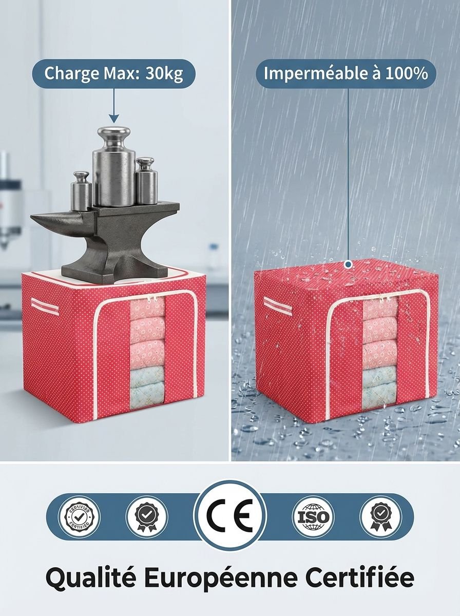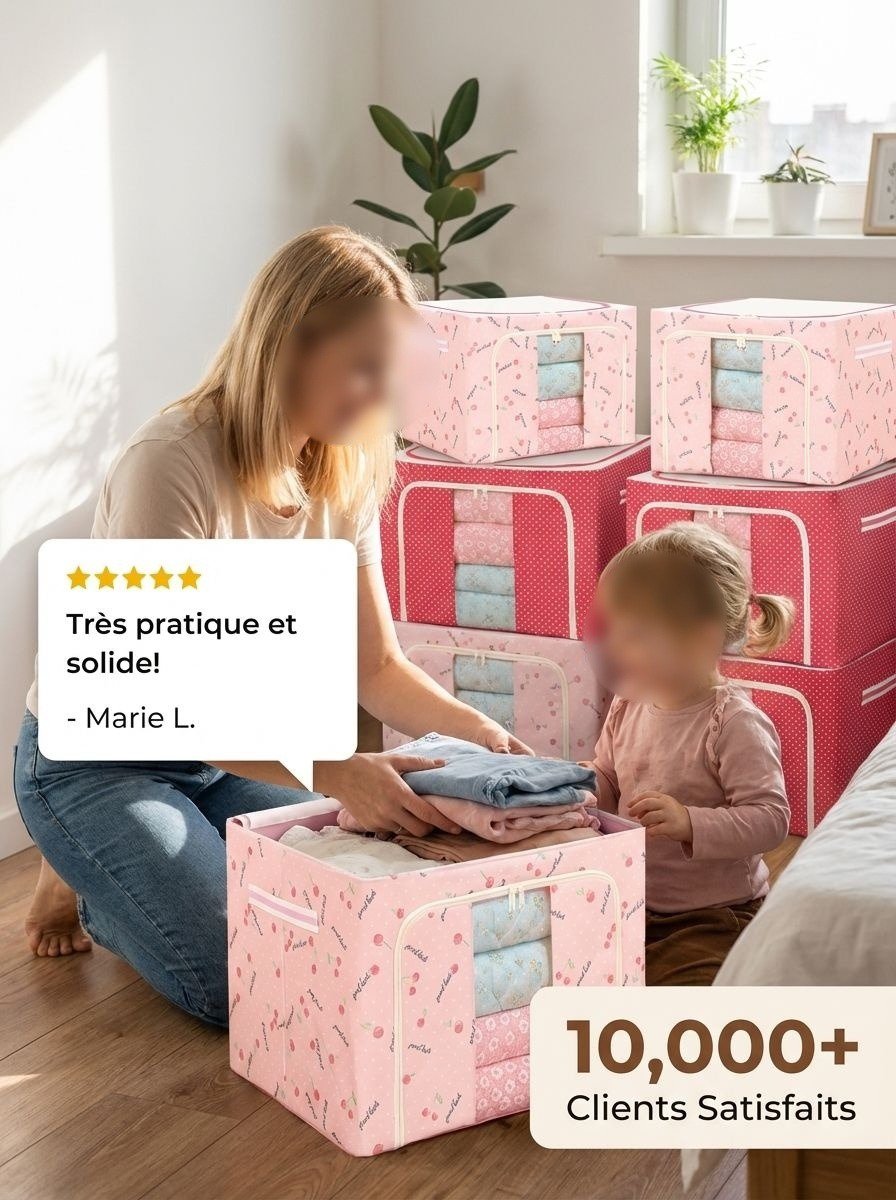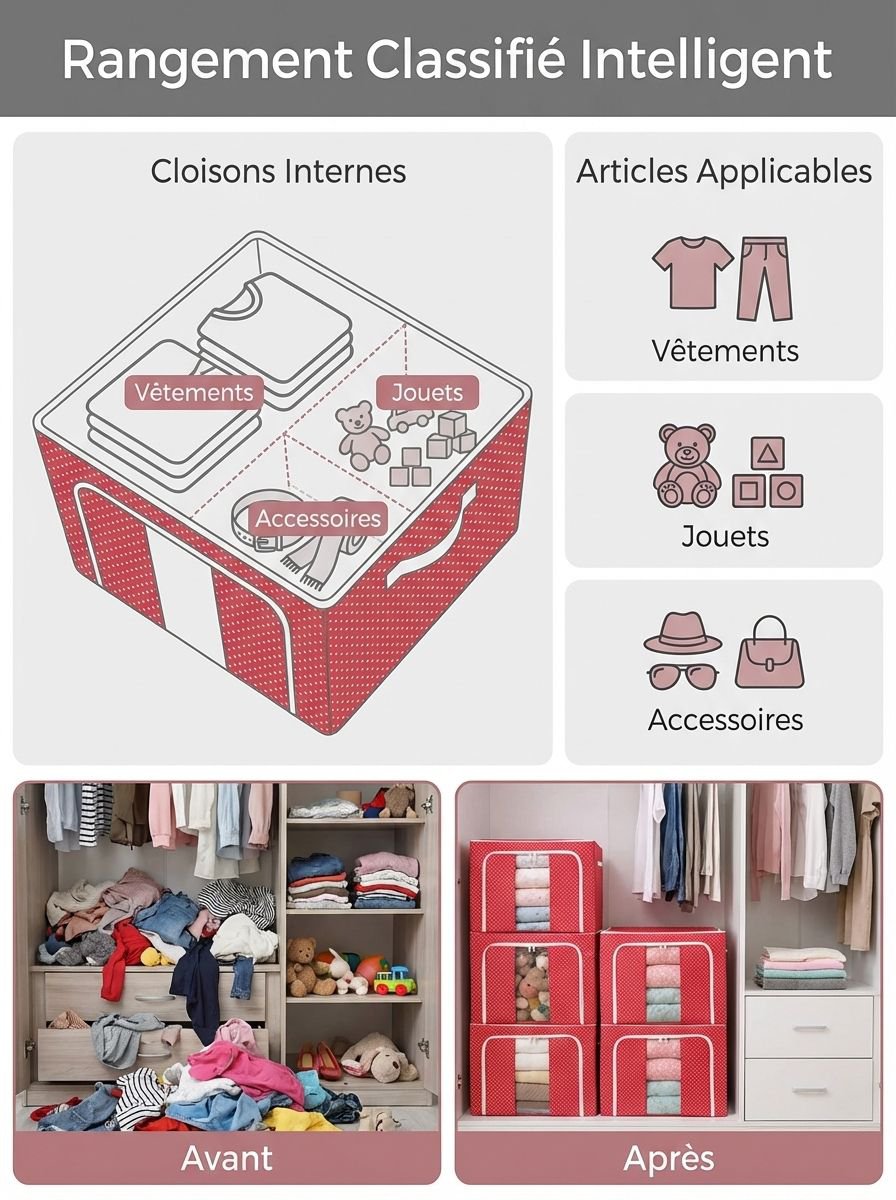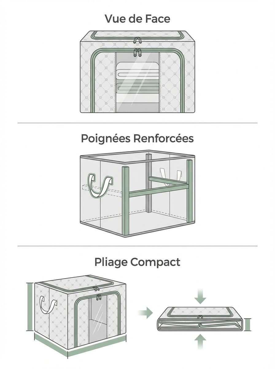 ● Fabriquée en tissu Oxford de haute qualité, cette boîte de rangement offre une excellente résistance à l’usure et protège efficacement vos affaires contre la poussière et l’humidité. ● Dotée d’un cadre en acier robuste, elle assure une stabilité parfaite et permet un empilement sécurisé pour optimiser l’espace dans votre maison. ● Design pliable et pratique, cette boîte se range facilement lorsqu’elle n’est pas utilisée, vous permettant de gagner de la place tout en gardant votre intérieur organisé. ● Grande capacité de stockage idéale pour vêtements, jouets, livres ou linge de maison, répondant à tous vos besoins de rangement quotidiens. ● Poignées renforcées sur les côtés facilitent le transport et le déplacement de la boîte, même lorsqu’elle est remplie d’objets lourds.